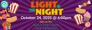 Come join us for Light in the Night coming up! October 24th at 6 PM out in our parking lot spread the Light of God’s Word! We will have trunk or treat, games, food and fellowship! If you are interested in volunteering for this event sign up here!