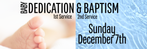 On December 7th, we will be having baby dedications and baptism! The baby dedications will be taking place during 1st service and the baptisms will be during second service.