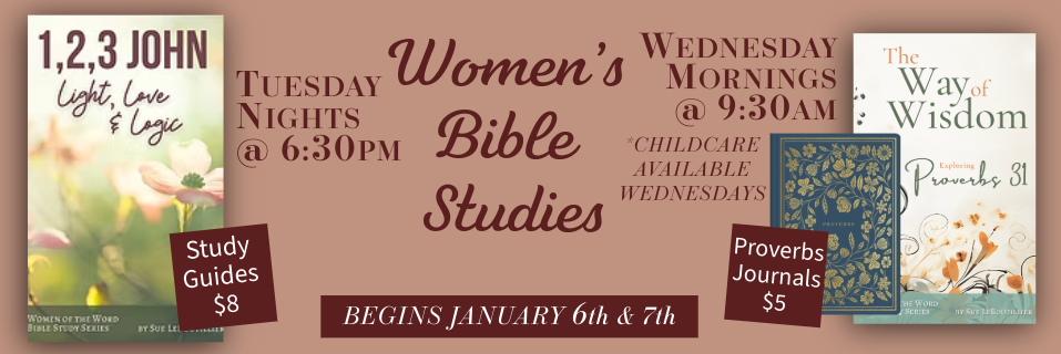 We have the joyful opportunity of studying Proverbs 31 with Sue LeBoutillier Wednesday Mornings at 9:30am. This is a 7-week Study that will take place Jan 7th through Feb 25th. The Study Guides for this study will be available at each week. Proverbs Journals are available for purchase for $5.